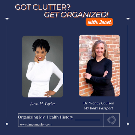 <p>Do you remember the date of your last annual exams? Do you know the results of your last test? Do you have a list of your doctors or medications handy? If your answer is I don’t know then tune in as Dr. Wendy Coulson, joins me as we discuss the importance of keeping your health information handy. Listen to my conversation with Dr. Wendy and discover:</p><p><br></p><p>· Why she is passionate about My Body Passport</p><p>· How important it is for us to organized our health information</p><p>· Ways we can make this a family tradition</p><p>· How her Mom uses the My Body Passport</p><p>· And More</p><p><br></p><p>Connect with Dr. Wendy Coulson:&nbsp;</p><p><br></p><p><a href="https://www.mybodypassport.com/">https://www.mybodypassport.com/</a></p><p><br></p><p><a href="https://www.instagram.com/mybodypassport/">My Body Passport (@mybodypassport) • Instagram photos and videos</a></p><p><br></p><p><a href="https://www.facebook.com/mybodypassport/">My Body Passport | Facebook</a></p><p><br></p><p><strong>Affiliate Partners:</strong></p><p><br></p><p>Audible: Get a FREE eBook and FREE 30-day trial from Audible <a href="http://www.audibletrial.com/doDBNy">www.audibletrial.com/doDBNy</a></p><p><br></p><p><strong>Connect with Janet:</strong></p><p><br></p><p>Website: <a href="https://janetmtaylor.com/">https://janetmtaylor.com/</a></p><p><br></p><p>Facebook Group: <a href="https://www.facebook.com/groups/livinglifetotallyorganized">https://www.facebook.com/groups/livinglifetotallyorganized</a></p><p><br></p><p><strong>Organizing Resources Mentioned in Episode:</strong></p><p><br></p><p>Organize &amp; Protect Important Documents: <a href="https://www.etsy.com/shop/OrganizePapersNow?coupon=JORGANIZER">https://www.etsy.com/shop/OrganizePapersNow?coupon=JORGANIZER</a></p><p><br></p><p>Secure Online Storage For Your Documents: <a href="https://2ndvault.com/?via=janet">https://2ndvault.com/?via=janet</a></p><p><br></p><p>Janet’s Amazon Organizing Products Picks (My Body Passport): <a href="https://www.amazon.com/shop/organizerjanet/list/1CIYAEOK3AD0X">Janet M Taylor's Amazon Page</a></p><p><br></p><p><strong>Ways You Can Support Our Podcast:</strong></p><p><br></p><p>Individuals: <a href="https://www.buymeacoffee.com/GCGOwithJanet">https://www.buymeacoffee.com/GCGOwithJanet</a></p><p><br></p><p>Businesses: <a href="https://www.shoutparty.com/shop/p/got-clutter-get-organized-with-janet">https://www.shoutparty.com/shop/p/got-clutter-get-organized-with-janet</a></p><p><br></p><p><strong>Social Media Platforms:</strong></p><p><br></p><p>YouTube video: <a href="https://www.youtube.com/janetmtaylor">https://www.youtube.com/janetmtaylor</a></p><p><br></p><p>Instagram: <a href="https://www.instagram.com/janettheorganizer/">https://www.instagram.com/janettheorganizer/</a></p><p><br></p><p>Pinterest:<u> https://www.pinterest.com/janetmtaylor/</u></p><p><br></p>--- Send in a voice message: https://podcasters.spotify.com/pod/show/janetmtaylor/message